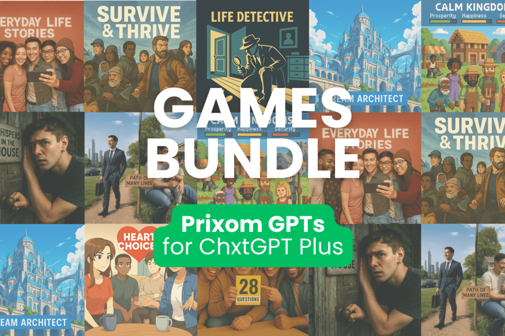 The Prixom™ Games Bundle gives you 9 custom GPT games you can play by yourself (or with friends watching) right inside ChatGPT. No installs, no apps—just story, choices, and vibes.